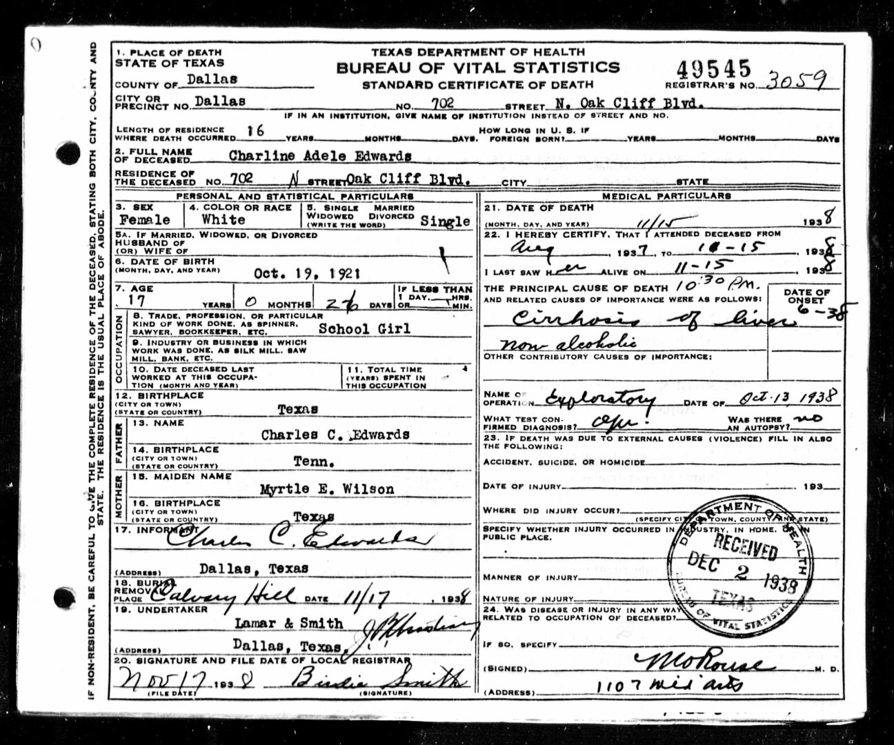 DEATH 15 NOV 1938 • Dallas, Dallas County, Texas, USA