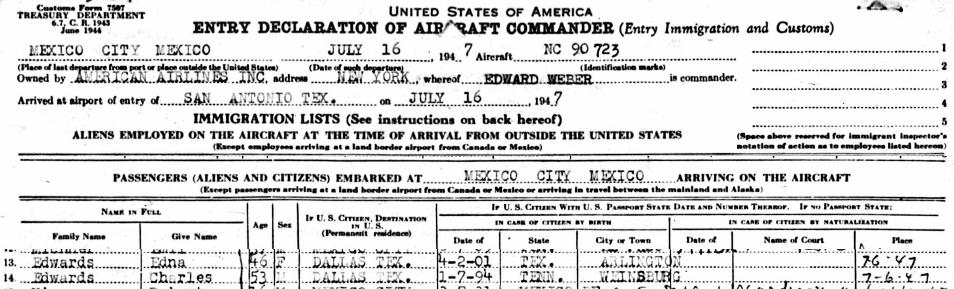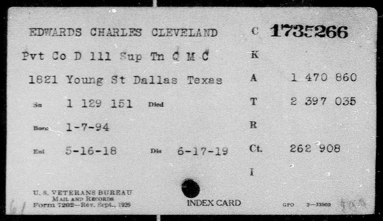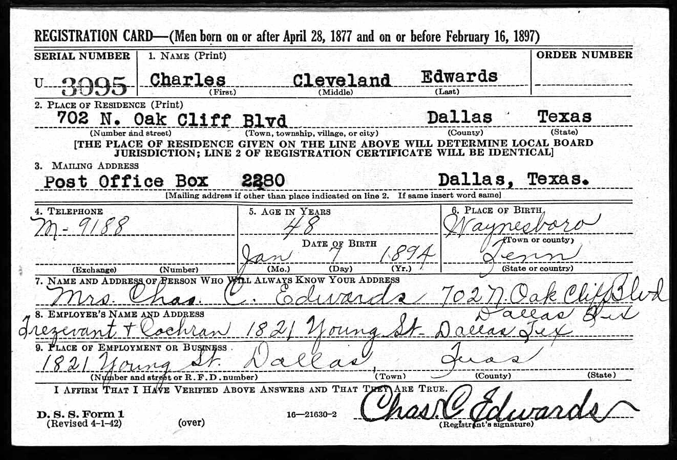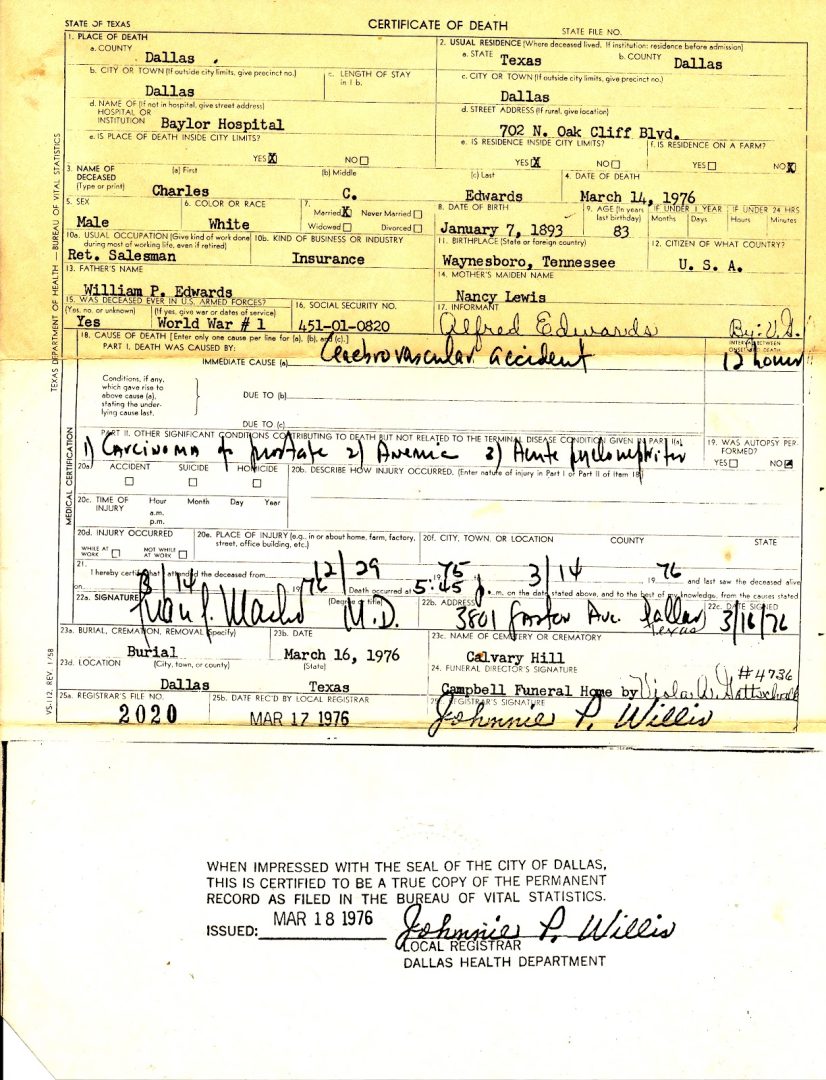 On March 14, 1976 Charles died in Dallas Texas of a stroke. He lived in the house at 702. Funeral services were held at St. Cecilia Catholic Church. Interred at Calvary Hill Cemetery in Dallas. Survived by son Alfred Edwards, sister Lova Edwards and grandsons Charles, Steven, Howard and Bill Edwards.