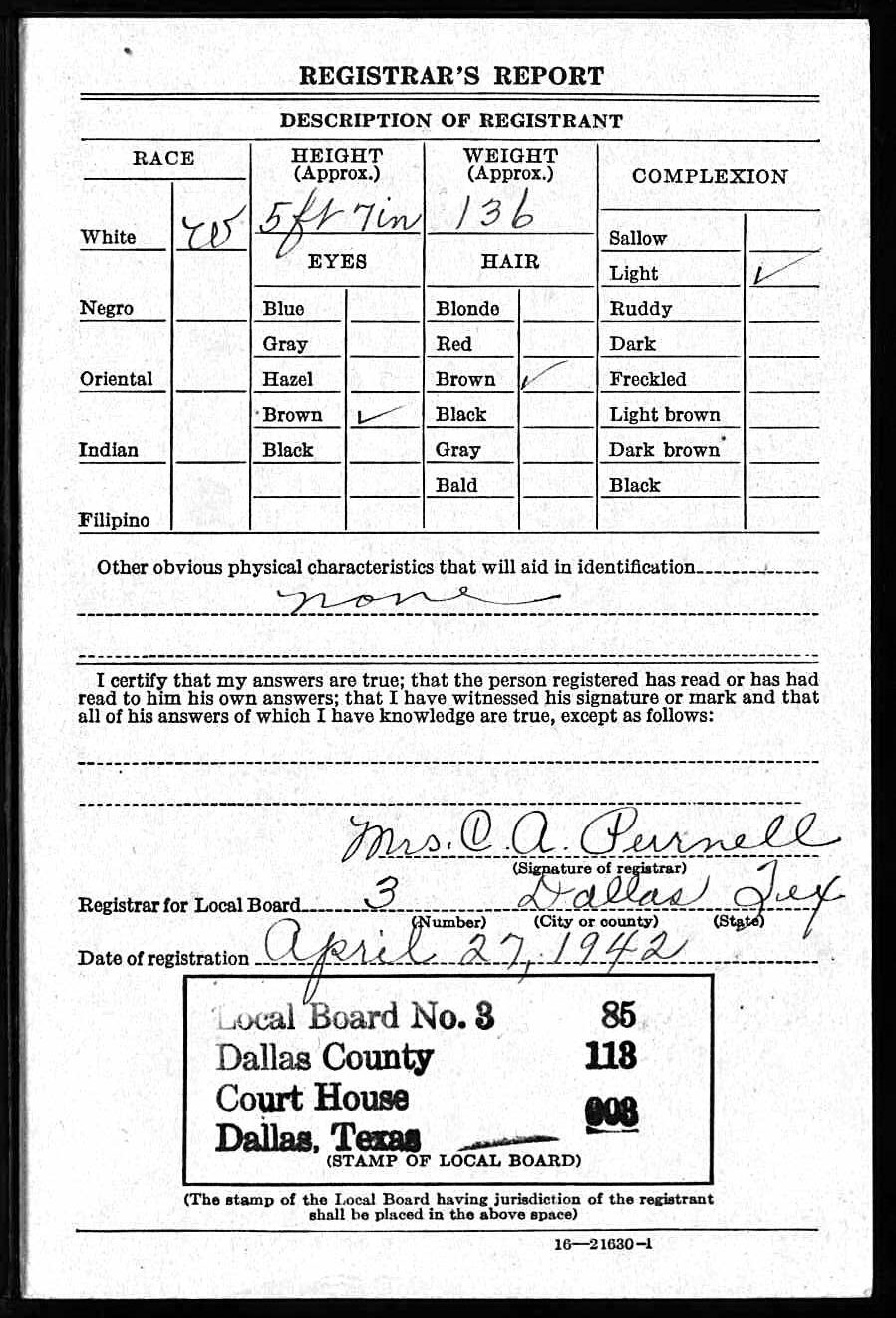 He served in the Army, serial number 129151, with Company D, 111th Supply Train. Brown hair and eyes standing 5 feet 6 inches.
