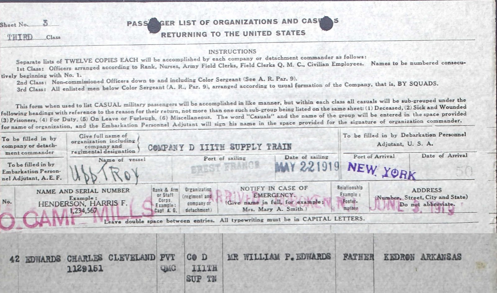On May 22, 1919 Charles was on board the USS Troy bound from Brest, France enroute to Hoboken, New Jersey. The ship arrived on June 3, 1919.