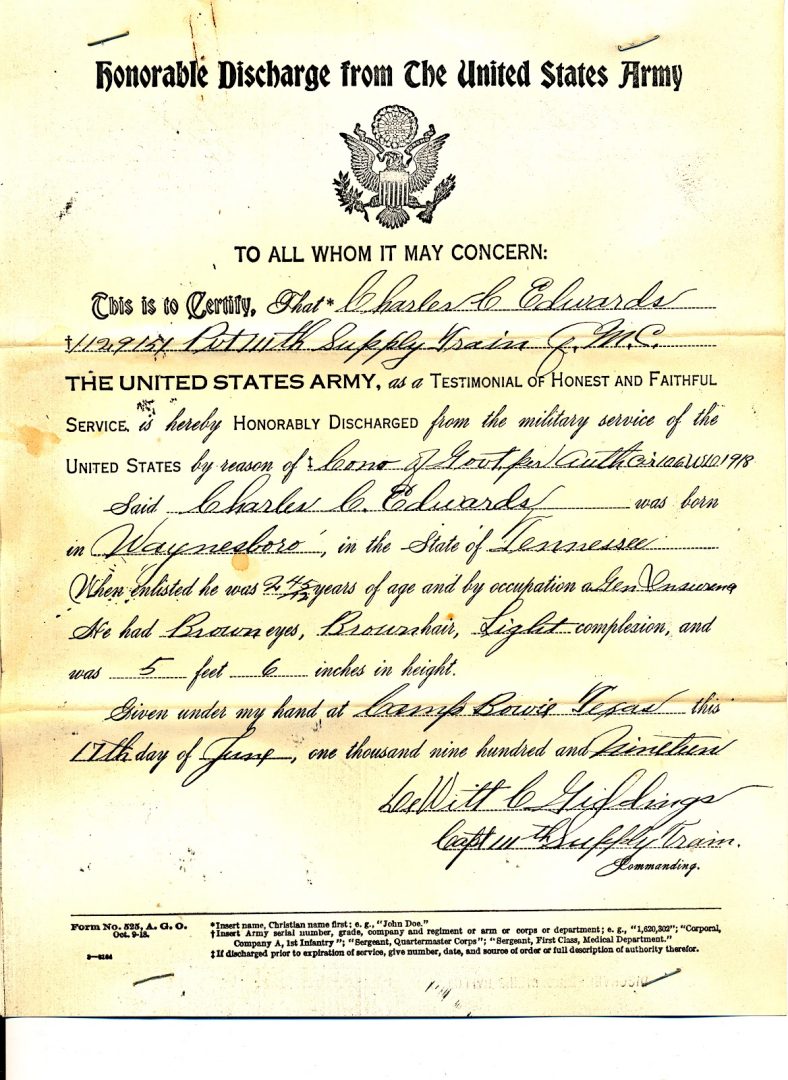 On June 17, 1919 Charles was officially discharged from the Army at Camp Bowie, Fort Worth.