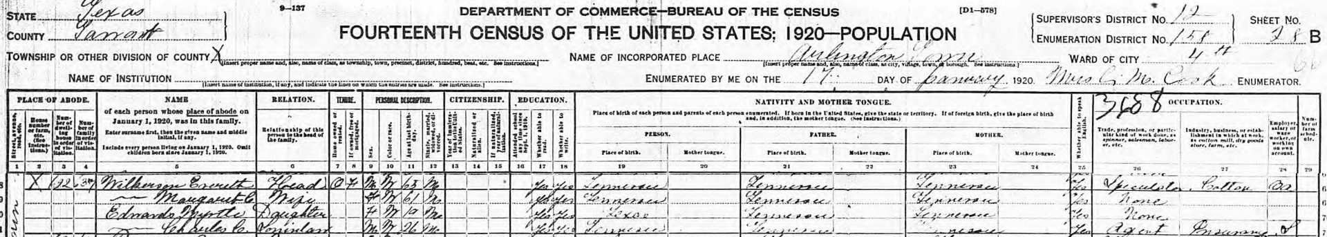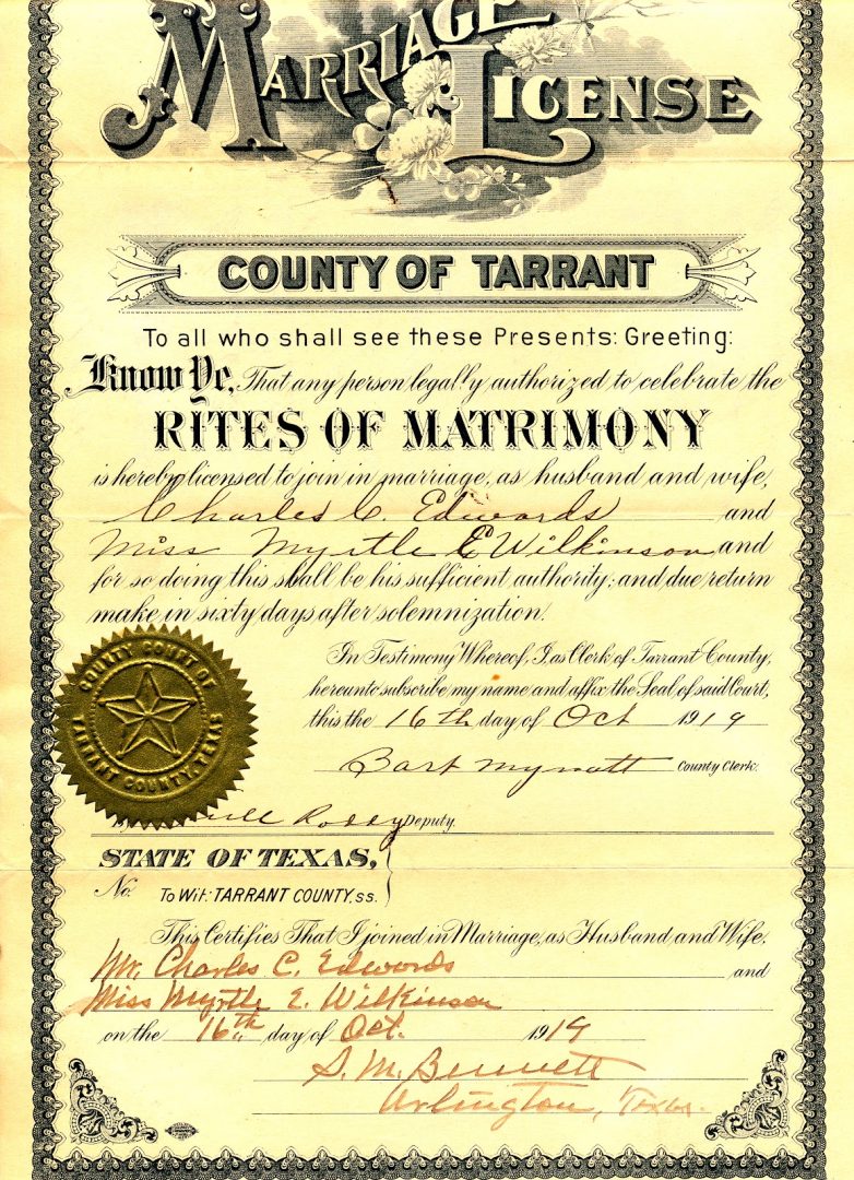 On October 16, 1919 Myrtle E Wilkinson married Charles Cleveland Edwards in Arlington, Texas.