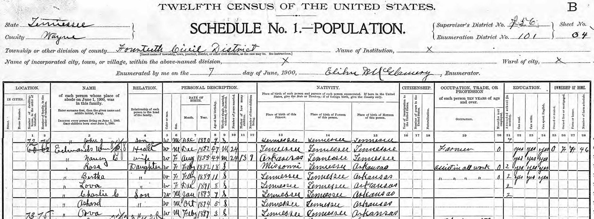 In June of 1900, “Charlie C” lived with his family in Wayne County, Tennessee. Charles has two brothers and three sisters living with him. Two sisters and one brother have already moved out. A total of nine children in the family. This document begins the debate of Charles’ birth year, ’93 or ’94.