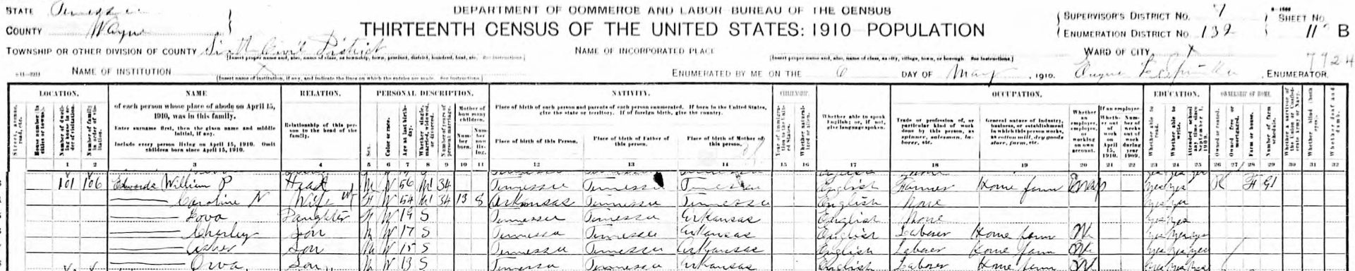 By 1910, Charley is living with his parents, one sister and two brothers. The family is still in Wayne County, Tennessee, but have moved to a different house.