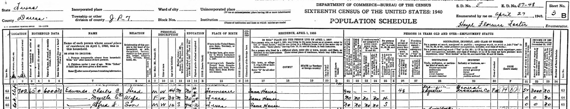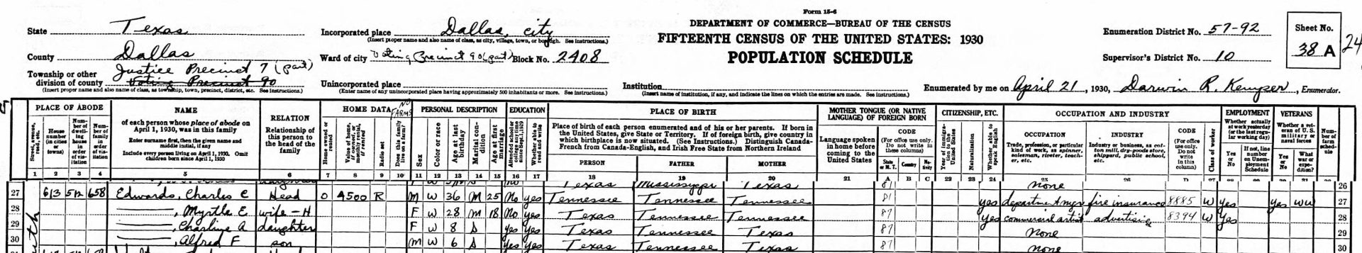 Charles, Myrtle and Alfred are living at 702 North Oak Cliff Blvd in Dallas, Texas. He is an insurance adjuster for a general insurance company, earning $3,000 a year.